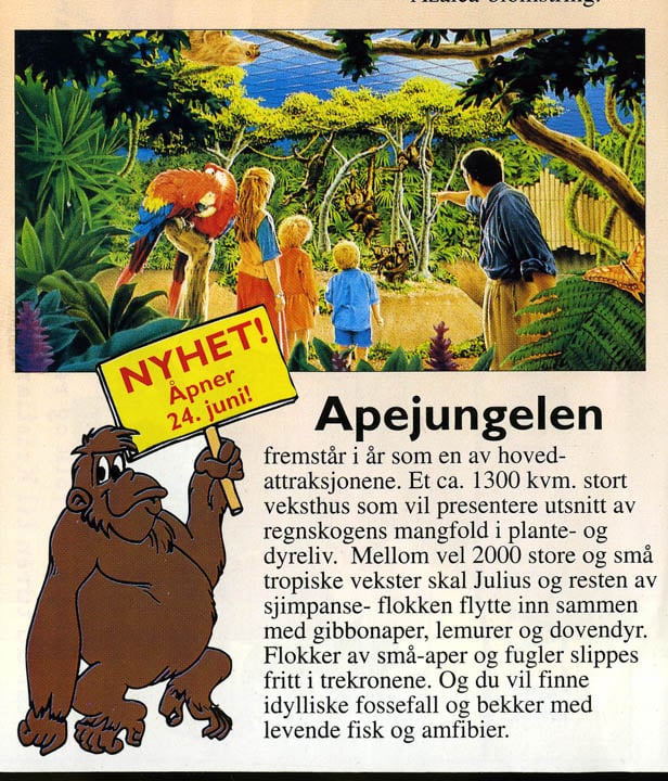 Publisert 20. september 2024 Apejungelen Det nye tropehuset ”Apejungelen” åpnes med pomp og prakt i juni 1994 av pop-ikon Morten Harket. Med seg har han sin kone og deres ett år gamle datter, som får hilse på Leo, en foreldreløs sjimpanse.