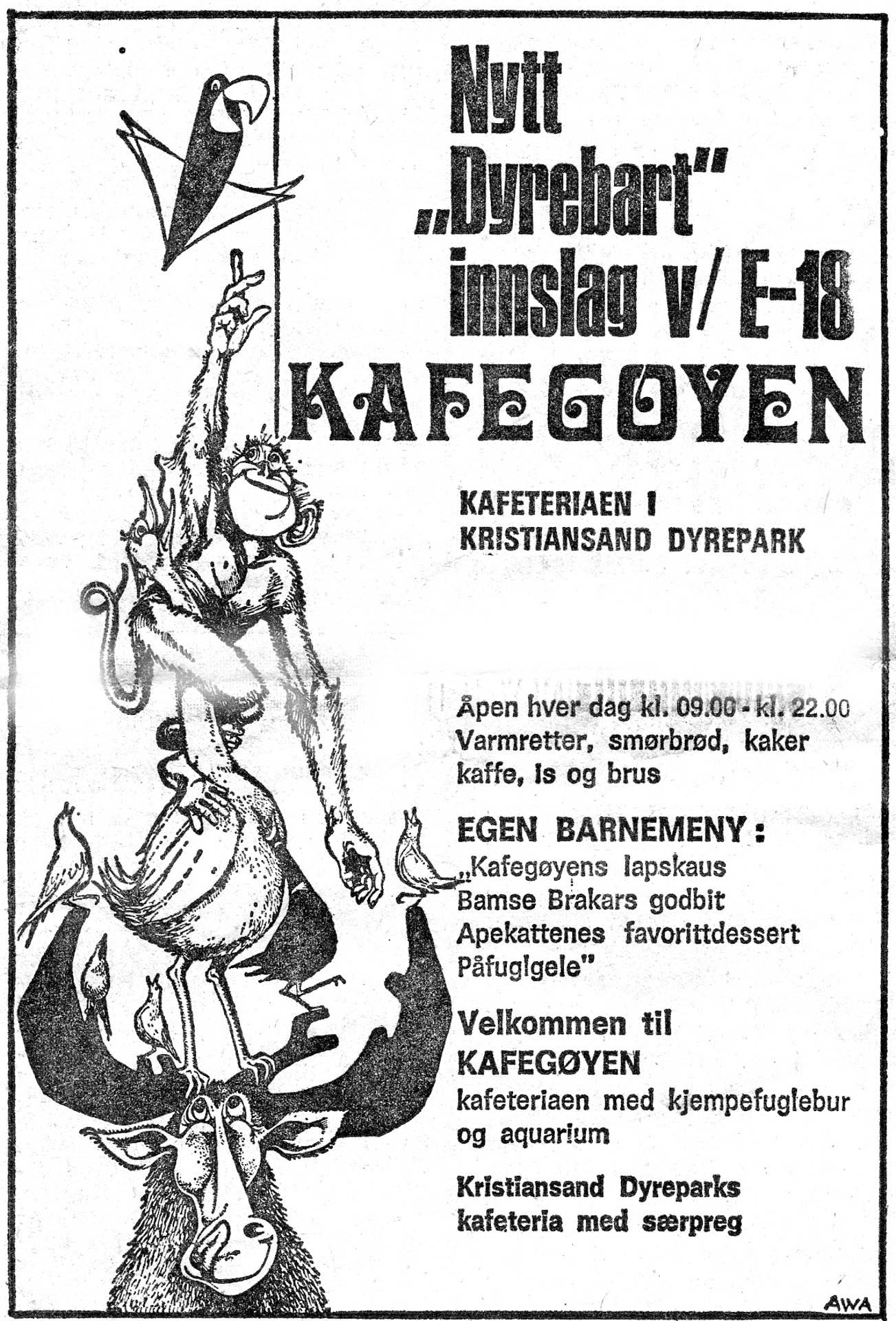 Publisert 20. september 2024 Første kafè: Kafegøyen Kro åpner 23. juni. Kroa blir et kjent og kjært stoppested for mange i flere tiår fremover, både gjester i Dyreparken, sørlendinger som ikke gadd å lage sin egen søndagsmiddag og trafikanter langs E 18 som trengte en pust i bakken.