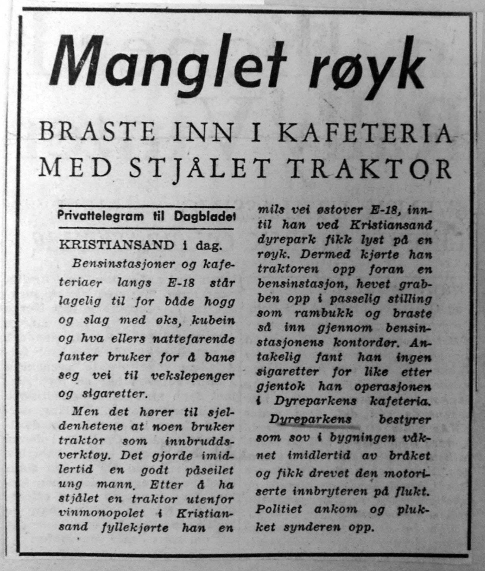 Stor anstrengelse: 1970 var tydeligvis det store innbruddsåret i Dyreparken. Karen som Dagbladet forteller om brukte en stjålet traktor som rambukk på sin febrilske leting etter røyk.